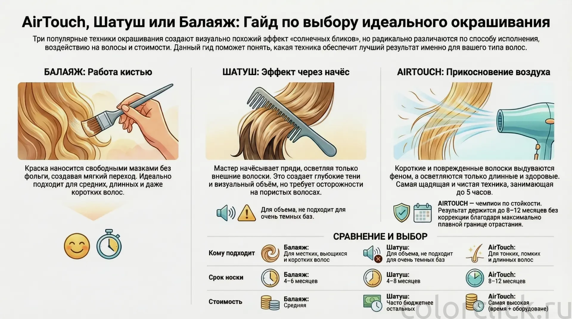 Диапазон по всем трём техникам — от 8 000 до 15 000 рублей на короткие волосы, на длинные и густые — от 15 000 и выше. Разница в цене между балаяжем и AirTouch объясняется не только временем (AirTouch в среднем на час дольше), но и расходниками: больше осветлителя, специализированное оборудование.