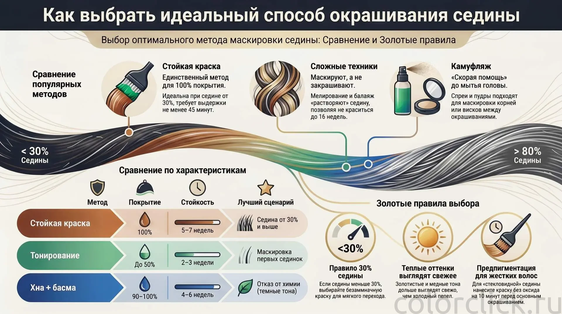 Седина до 30% и седина 80% — это разные задачи, и решения у них разные. Один метод даст стойкое покрытие на шесть недель, другой едва продержится до следующего мытья. Чтобы не перебирать варианты методом проб, удобнее сравнить их сразу по ключевым параметрам.