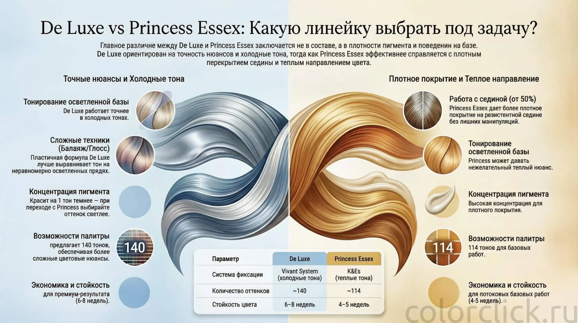De Luxe — Vivant System, Princess Essex — K&Es молекулярная система. Это не маркетинг, а реальное различие в том, как пигмент фиксируется в структуре волоса. На практике: De Luxe стабильнее держит холодные рефлексы, Princess — тёплые.