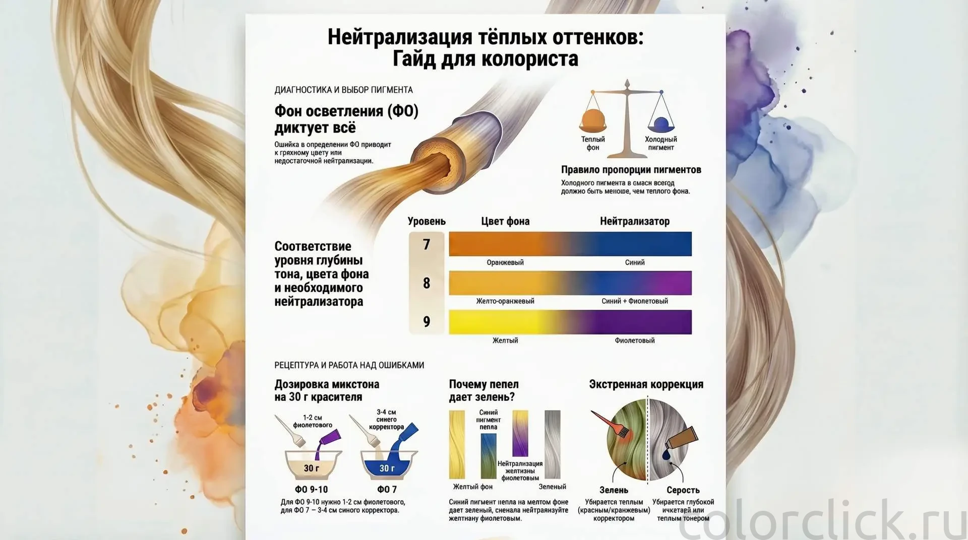 Оранжевый фон после осветления, желтизна через две недели после тонирования, зеленоватый блонд после пепельного тонера — всё это следствие одного и того же: нейтрализация была выбрана без учёта конкретного фона осветления. Разберём, как работать с тёплыми подтонами системно, а не методом подбора.