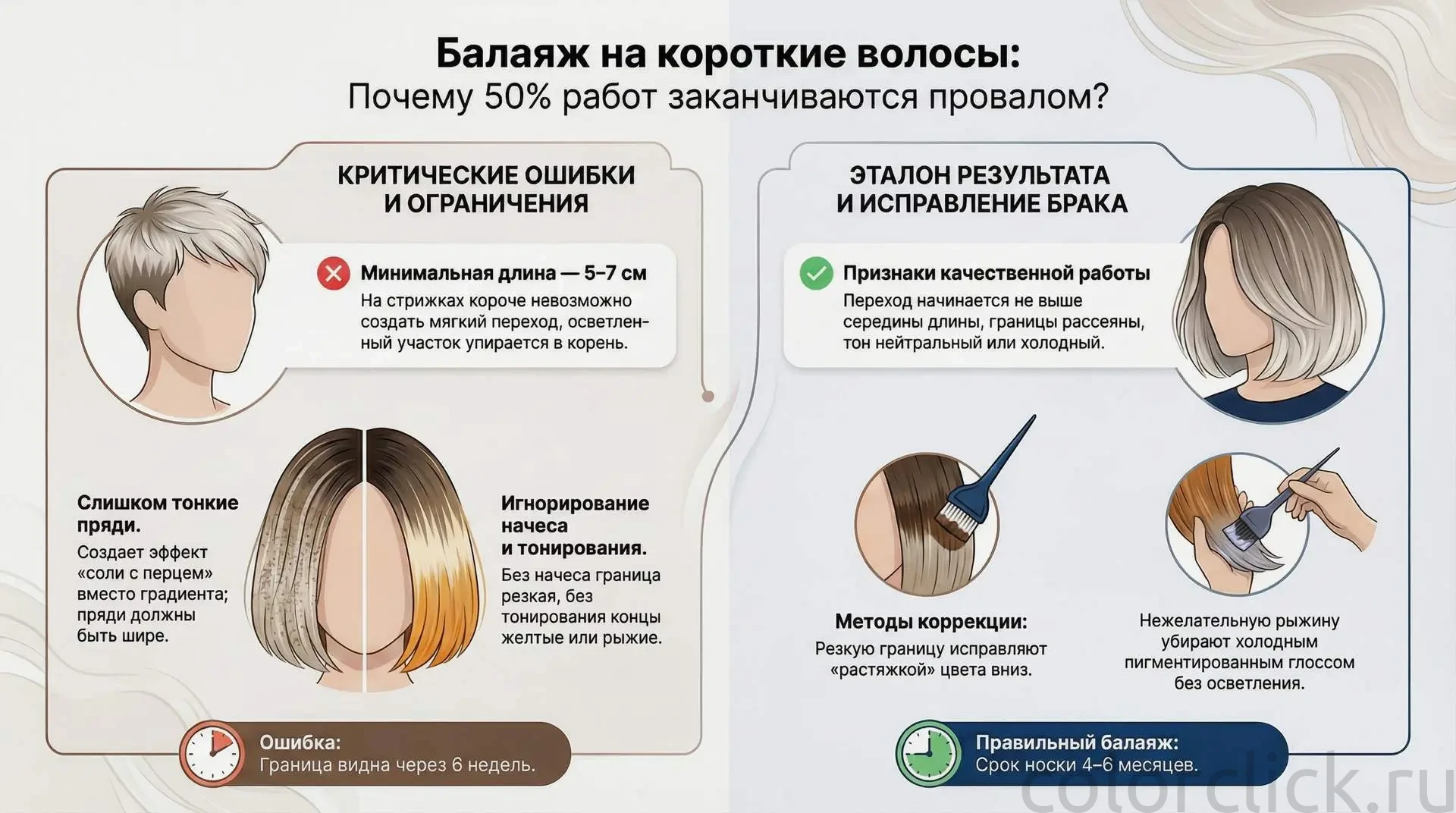 Без тонирования балаяж почти всегда выходит с жёлтым или рыжим оттенком на концах. На длинных волосах это частично скрывает объём и укладка. На коротких каждая прядь на виду, скрыть нечем. Тонирование — не дополнительная опция, а часть технологии, без которой работа не закончена.