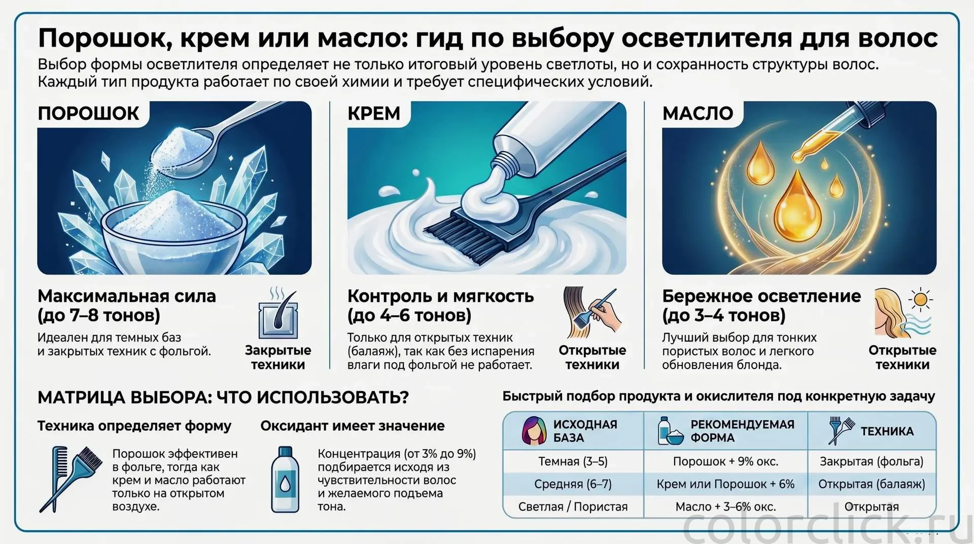 Выбор формы осветлителя напрямую определяет результат — не только итоговый тон, но и состояние волос после процедуры. Три формы работают по разной химии, дают разный подъём и подходят под разные техники. Разберём логику выбора, а не просто перечислим плюсы и минусы.