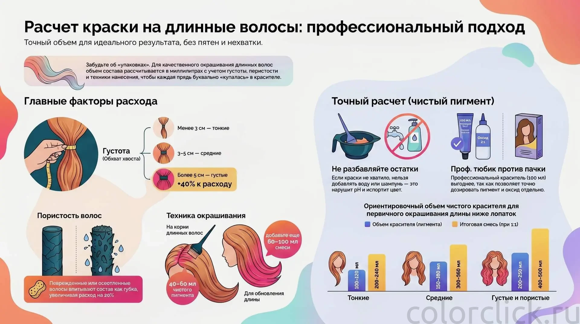 При расчете расхода состава на длину ниже лопаток большинство ориентируется на количество упаковок, купленных в супермаркете. Это главная ошибка, которая приводит либо к пятнам из-за попытки растянуть остатки смеси по сухим прядям, либо к лишним тратам. В профессиональной среде мы оперируем граммами и миллилитрами, учитывая не только сантиметры от макушки до кончиков, но и пористость, густоту и тип выбранного продукта.