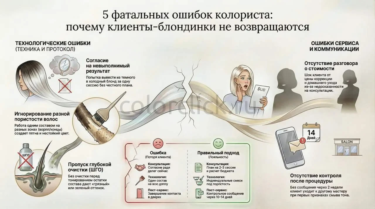 На первичной консультации нужно проговаривать полный цикл: стоимость поддержания, частоту визитов (каждые 6–8 недель для холодного блонда), изменение структуры волос и необходимость усиленного домашнего ухода. Если клиент не понимает, во что он входит — он уйдёт не из-за качества работы, а из-за несовпадения ожиданий и реальности.
