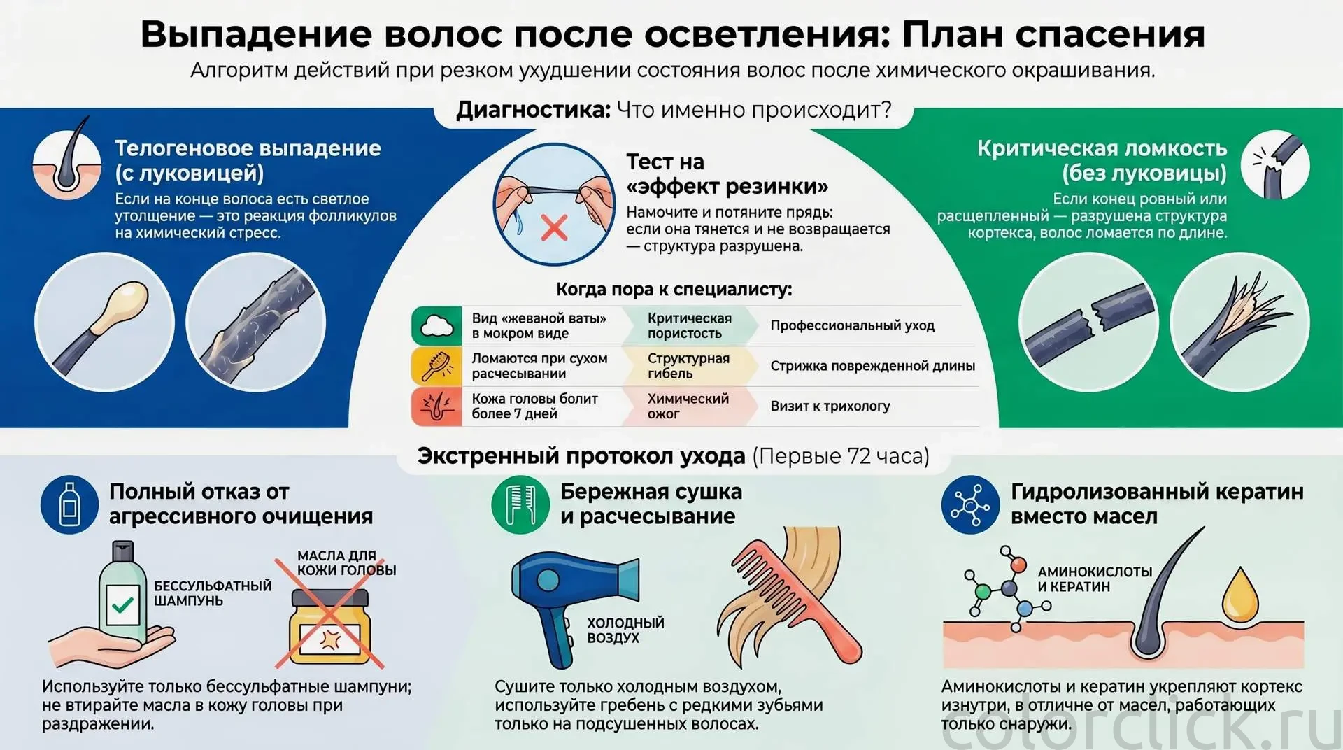 Если через 7–10 дней интенсивное выпадение не снижается, появились проплешины, или кожа головы болит при касании — это повод для трихолога, а не для очередной маски. Телогеновая алопеция после химического ожога требует отдельного лечения, которое домашний уход не заменит.